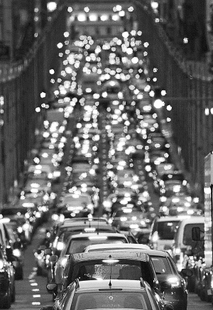 10月6日傍晚,众多车辆拥堵在比利时首都布鲁塞尔的一条主要街道上。 新华社记者武巍摄