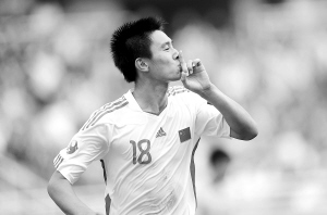 | 中国青年队球员朱建荣庆祝进球。