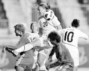 北京时间10月7日,在美国宾夕法尼亚州切斯特举行的中美女子足球友谊赛中,中国队以1:1战平美国队。图为双方球员在比赛中争顶。 新华社发