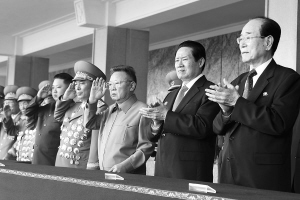 | ↑朝鲜劳动党总书记、国防委员会委员长金正日(右)和朝鲜劳动党中央军事委员会副委员长金正恩(左)同10万平壤各界群众一起观看阅兵式。