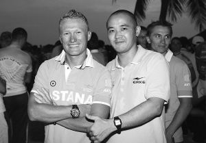 2010年10月10日,在2010年环海南岛国际公路自行车赛开幕式上,来自阿斯塔纳职业队选手亚历山大·维诺库洛夫(左)和本届环岛赛裁判刘正东合影。 亚历山大·维诺库洛夫曾在环法赛中取得过爬山王的优异成绩。 海南日报全媒体中心记者 宋国强 摄
