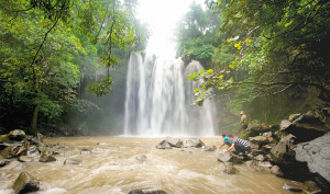 | 落差20米的临高县居仁瀑布飞瀑倾泻。 |