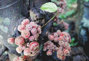 | 居仁瀑布旁,一颗老树树干结满野果。 |