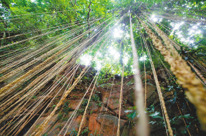 | 飞泻的居仁瀑布旁,千丝万缕的藤条垂直而下。 |