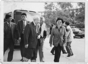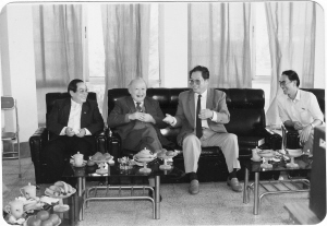 | 钱伟长(左二)在海南与学生尹双增(右二)相谈甚欢,约摄于1991年。