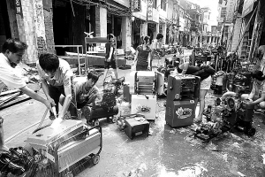 | 10月10日,文昌市文城镇文东巷沿街商铺清理被淹物品。