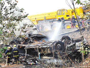 10月9日,在宁合高速引导线由西向南京方向,一辆水泥槽罐车与一辆湖北籍大客车因大雾相撞,起火后冲出护栏,翻到匝道下(距离路面5米),槽罐车叠压在大客车上。事故已造成17人死亡,23人受伤住院,其中6人重伤。 新华社发