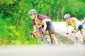 | 车手们在保亭至五指山之间的盘山公路上骑行。