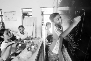 | 10月12日,一个小朋友吃完午饭后高兴地在黑板上涂鸦。安置在文昌市文城镇的受灾群众,每天都得到当地政府的关心和照顾。 本报记者 苏晓杰 摄 |