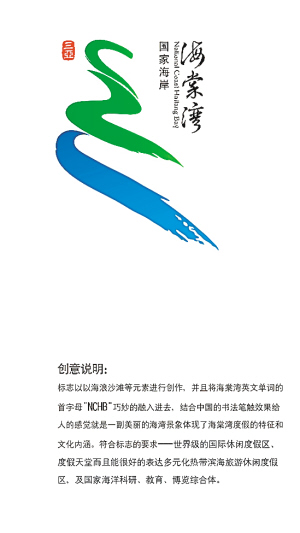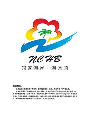 标志以海浪沙滩等元素进行创作,并且将海棠湾英文全称“National Cost Haitang Bay”首字母“NCHB”巧妙地融入进来,结合中国的书法笔触效果,给人的感觉就是一副美丽的海棠湾景象,体现了海棠湾度假的特征和文化内涵。
