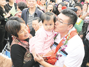 10月12日,一名北京援建者在亲吻欢送人群中的小女孩。当日,在四川什邡参加灾后援建的北京援建工作人员开始返京,数万什邡群众聚集在道路两旁欢送北京援建“亲人”。北京对口援建什邡累计投入资金近70亿元,108个援建项目目前已全部竣工。 新华社发