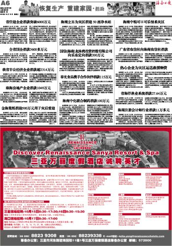 海南日报 恢复生产 重建家园·捐助 006 2010-10-131 2010年10月13日 星期三