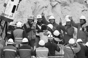 当地时间13日凌晨0时10分,身着特制防潮抗菌服、佩戴防护镜的第一名矿工弗洛伦西奥·阿瓦洛斯随救生舱“凤凰2号”升上地面。顿时,现场爆发出一阵震耳欲聋的欢呼和掌声,人群中响起“智———利———智利矿工”的欢呼声。阿瓦洛斯的妻子和年幼的儿子与久别的亲人热烈拥抱。
