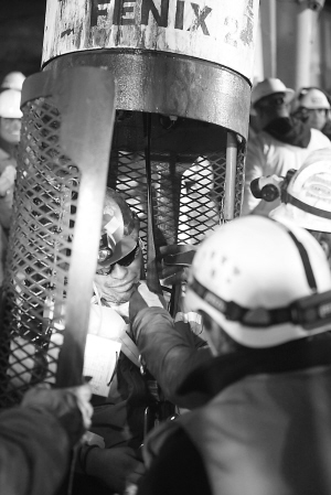 | 第7名获救矿工何塞·奥赫达(救生舱内)顺利抵达地面。 |