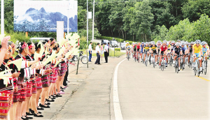 | 参加环岛赛的车手随时随地受到观众欢迎,图为第三赛段举行期间,车手在琼中赛段受到市民列队欢迎。
