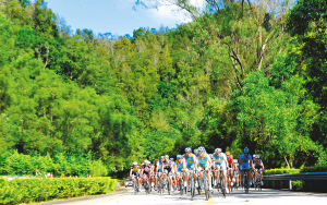 | 10月13日,环岛国际公路自行车赛车队进入五指山市深山密林,穿行于绿色海洋中。 本报记者 苏建强 摄 |