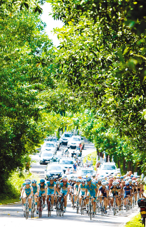 | 10月15日,参赛车手骑行经过定安境内,道路两旁的成荫绿树给各国参赛车手留下深刻印象。 海南日报全媒体中心记者 宋国强 摄 |