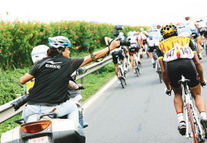 | 10月15日,一位乘坐摩托车的摄影记者在抓拍比赛镜头。