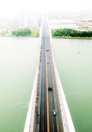 | 环岛赛第五赛段终点落在海口,图为车队行驶在海口标志性建筑之一的世纪大桥上。