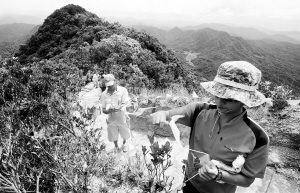 | 十月十五日,几位工作人员正在为尖峰岭重阳登山比赛拉彩旗路标。 本报记者 苏晓杰 摄 |