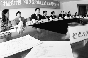 10月15日,包括预防“校园猝死”内容的中国遗传性心律失常救助工程启动新闻发布会在北京举行。来自中国心率学会、中国心电学会、北京大学人民医院和广东汕头大学第一附属医院等医疗机构的20余位专家在启动仪式上发言。 新华社记者 汪永基 摄