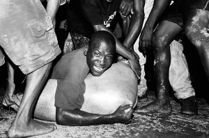 | ↑2009年,由于持续上涨的粮食价格引发海地严重骚乱。图为海地一名男子与村民争夺一包大米,这包大米从过路的卡车上意外掉下,当地村民一哄而上。 |
