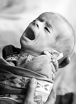 | ↑这是2002年7月13日,一名5个月大营养不良的阿富汗婴儿在母亲怀中哭泣。 |