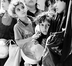 | ↓这是2003年3月28日,在伊拉克首都巴格达一家清真寺门外,伊拉克女孩排队等待领取食品。 |