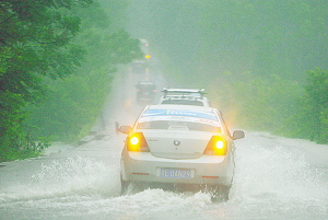 因雨势过大,道路积水,环岛赛车队冒着大雨进发。 海南日报全媒体中心记者 汪承贤 摄