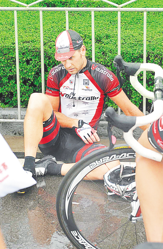 10月17日,环岛赛第七赛段比赛结束后,一名车手累得靠在路边护栏上。 海南日报全媒体中心记者 苏建强 摄