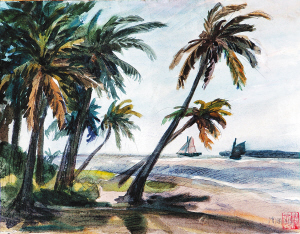 这次回乡,心情澎湃的符罗飞创作了一批以家乡为题材的作品。除了与《海南日报》美编邝海星共同创作的《出铁了》等反映大跃进的速写外,还有《文昌村景》《清澜港湾》《通什远眺》等作品。
