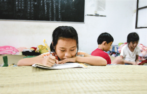 10月17日,文昌市龙楼镇星光村受灾群众安置点,小学五年级学生符玉洁在抓紧时间做功课。 本报记者 李英挺 特约记者 许环峰 摄