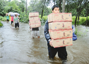 10月17日,海口市琼山区龙塘镇政府向该镇心雅村的受灾群众发放食物、水和基本生活用品,解决他们的温饱问题。 通讯员 龙泉 摄