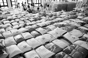 10月17日,万宁市人大礼堂里堆放的救灾物资正在按计划向受灾群众发放。目前,万宁市已经发放了1万支蜡烛、600顶帐篷、1万床席子、2000床棉被、800吨大米等救灾物资,受灾群众生活得到妥善安置。 本报记者 王凯 摄