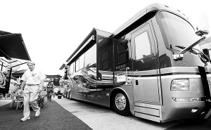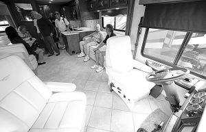 ↑人们在一辆价值20万美元的大型房车内试坐。