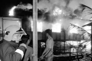 →10月18日,在马来西亚沙巴州首府哥打基纳巴卢附近的贫民区,当地居民与消防员在火场救火。当晚,哥打基纳巴卢附近的贫民区发生火灾,逾百间木屋被烧毁,千余人流离失所。 新华社发