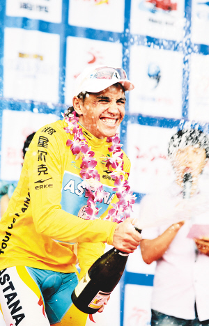 | 荣获2010年环岛赛个人总冠军的阿斯塔纳队车手伊格林斯基身上漂亮的黄衫为赞助商大大加分。