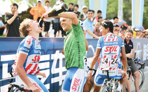 | 环岛赛结束,车手激情得到释放。图为阿斯塔纳队队友将总冠军伊格林斯基的香槟“抢走”后与队友分享。 海南日报全媒体中心记者 苏建强 摄 |