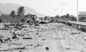 但是,今天下午4时,忽然又有一个大的泥石流发生,部分泥水、石头又被冲到路面上。现场指挥部决定:停止施工,一切人员、车辆、设备撤出现场,继续进行封闭东线高速陵水至万宁段。