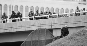 10多名警察排成一队,对南侧草坪展开搜索。弗吉尼亚警方暂时关闭附近一段高速公路,以配合调查。