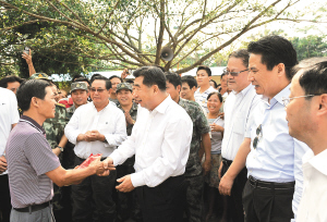 | 十月十九日下午,回良玉在海口市琼山区龙塘镇龙新村委会文南村慰问受灾群众和救灾部队,并向村干部代表送上慰问金。 本报记者 王凯 摄 |