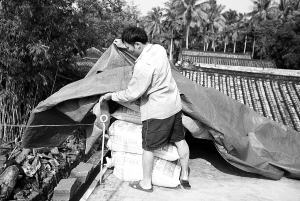 | 10月20日,为防台风侵袭,琼海市塔洋镇联先村委会加浪村村民王甲坤,将稻谷扛上房顶堆放。 本报记者 苏晓杰 摄 |