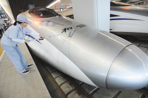 10月20日,一位列车服务人员正在上海虹桥站清洗国产“和谐号”CRH380A型新一代高速动车组。 沪杭高铁开通在即,国产“和谐号”CRH380A新一代高速动车组进入正式运营前的最后调试阶段。 新华社记者 鞠焕宗 摄