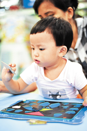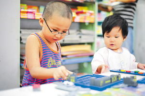 ①在广州天河购书中心早教益智玩具柜台前,两名幼童正在体验益智玩具。