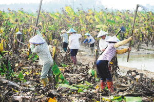 | 10月21日,琼海市塔洋镇农民清理被洪水浸泡过的香蕉田,准备改种瓜菜。 特约记者 蒙钟德 摄 |