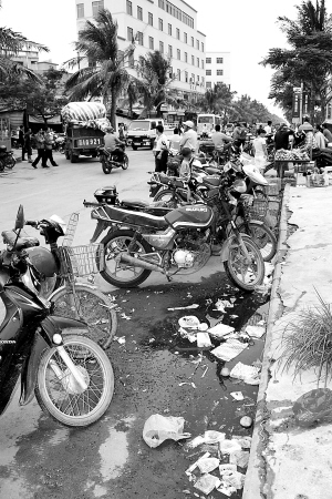 | 十月二十一日,海口琼山大道北灵山镇东头村段已被菜贩占据,小商贩乱占公路、沿路乱堆放材料、乱停放各类车辆,污水、垃圾到处可见,交通堵塞。 本报记者 张中宝 摄 |
