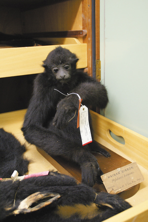 | 英国自然历史博物馆采集于1891年的海南长臂猿模式标本。费乐思 摄 |