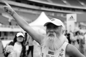 10月24日,一名来自沈阳的老人在北京国际马拉松比赛后庆祝,这是老人第10次参赛。 新华社发