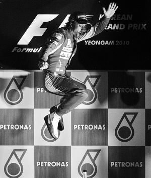 24日,在F1韩国大奖赛上,效力于法拉利车队的西班牙车手阿隆索夺得冠军。图为阿隆索在颁奖仪式上庆祝。 新华社发