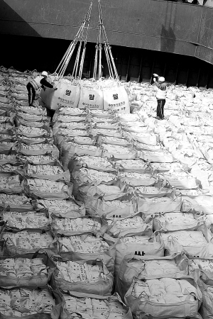 10月25日,韩国红十字会向朝鲜水灾受害地区提供的物资被装运上船。 韩国红十字会向朝鲜水灾受害地区提供的5000吨大米和300万个碗装方便面25日分别在群山和仁川港举行了起航仪式。 新华社/联合通讯社